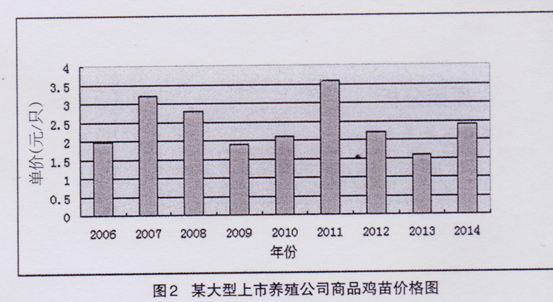 由連續統計9年的商品雞苗價格柱形圖可以很直觀看出,全年平均價格超過3元/只的有2年。2.5元/只左右的有2年,2元/只左右的有4年,1.5元/只的1年,由此可見,只要全年產苗平均,對于價格風險還是有一定的抵抗能力,這也是大公司的優勢。
